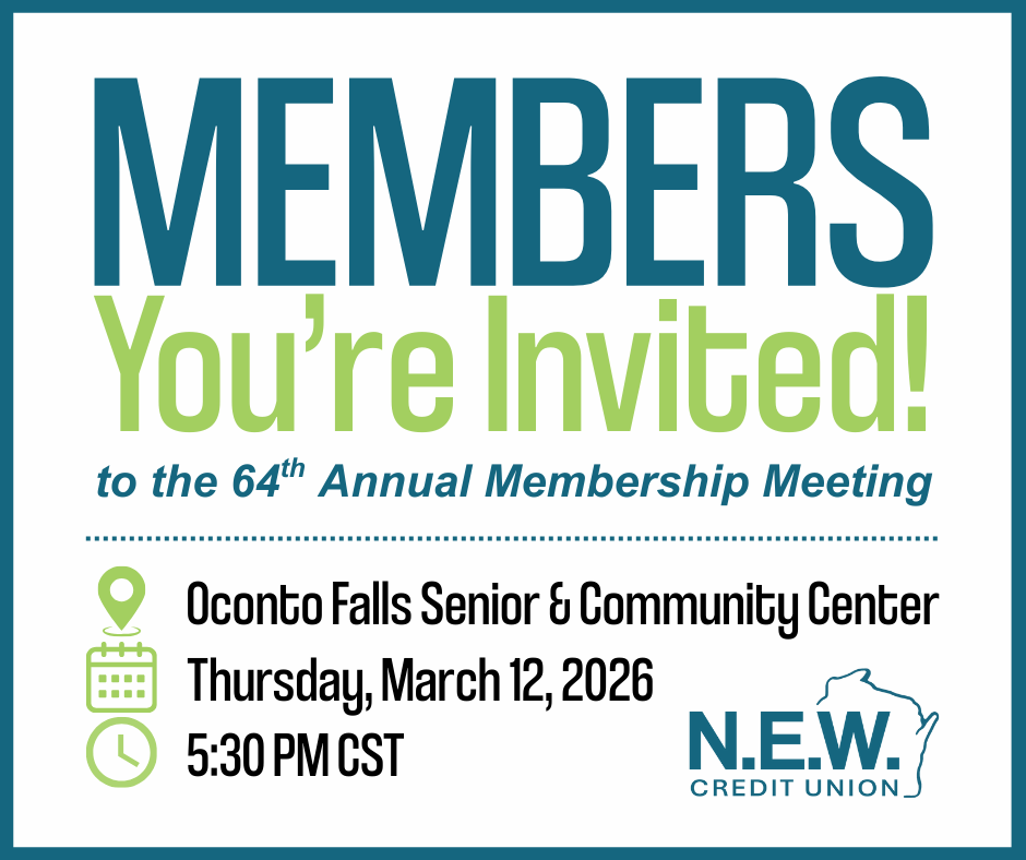 You have a voice – and we want to hear it. All members are invited to N.E.W. Credit Union’s 64th Annual Membership Meeting to make their voices heard on how we can serve you better. After all, as a member, you are an owner of N.E.W. Credit Union. We will also discuss our 2025 Annual Report, present our H.P. Heckendorf Volunteer of the Year Award and hold elections for our Board of Directors.